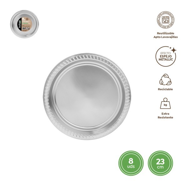 PLATO LLANO REDONDO PREMIUM REUTILIZABLE 23CM 8U. PLATA METAL