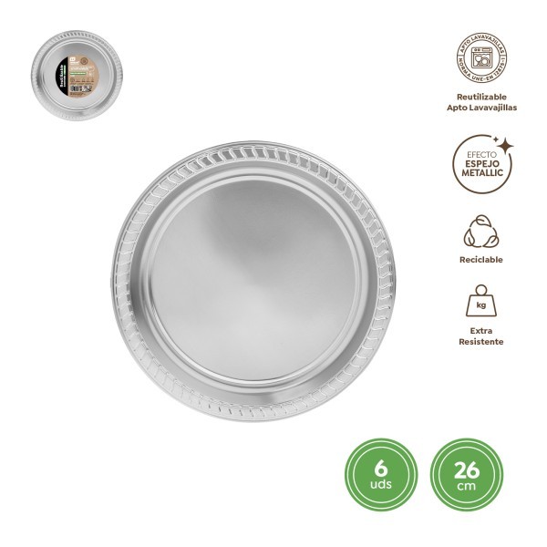 PLATO LLANO REDONDO PREMIUM REUTILIZABLE 26CM 6U. PLATA METAL