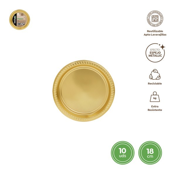 Aporta estilo y brillo a tus comidas con este plato llano redondo color dorado. Pack de 10 unidades. Diámetro: 18 cm.