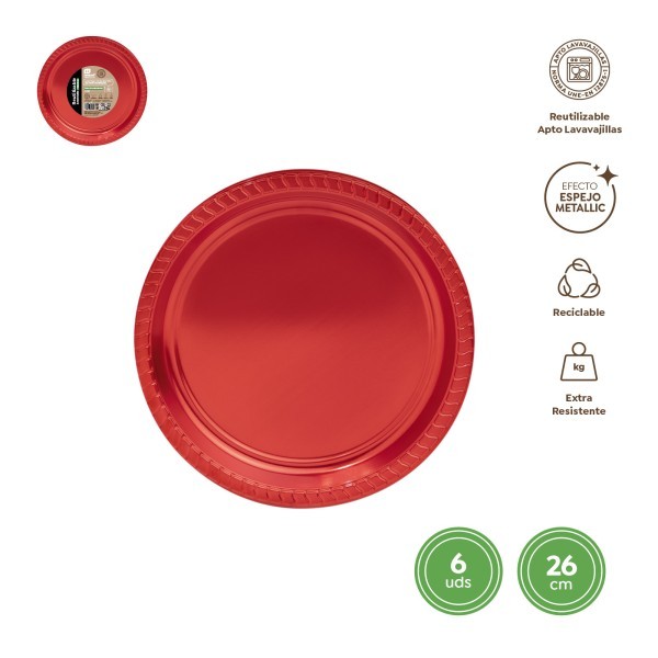 Aporta estilo y brillo a tus comidas con este plato llano redondo color rojo metálico. Pack de 6 unidades. Diámetro: 26 cm.