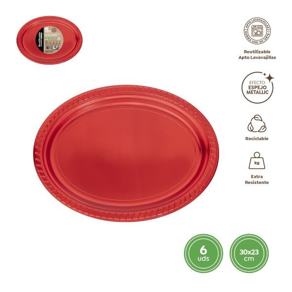 Luce tus aperitivos y postres con elegancia gracias a esta bandeja ovalada reutilizable color rojo metálico. Pack de 6 unidades. Medidas: 30 x 23 cm.
