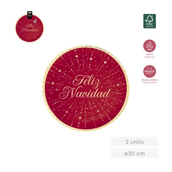 Pack de 2 platos de cartón con efecto metálico dorado y diseño navideño en color rojo con el mensaje “Feliz Navidad”. Diámetro: 30 cm.