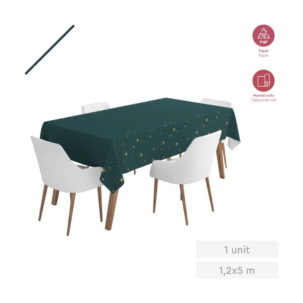 Añade un toque de elegancia y magia navideña a tu mesa con este mantel de papel en color verde oscuro con estampado de estrellas doradas. Medidas: 1,2 x 5 m.