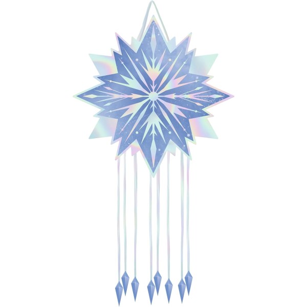 Convierte cualquier celebración en un evento mágico con esta preciosa piñata en forma de copo de nieve iridiscente, ideal para fiestas temáticas de invierno o inspiradas en cuentos de hielo. Medidas: 45 x 45 cm.