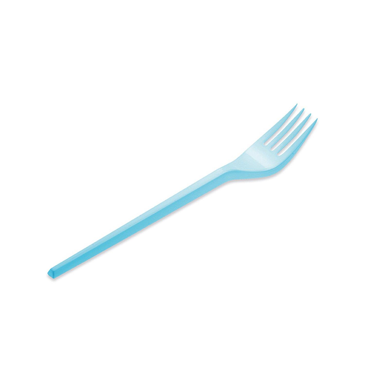 Pack de 15 tenedores en color azul nube de 16,5 cm fabricado en poliestireno alimentario.