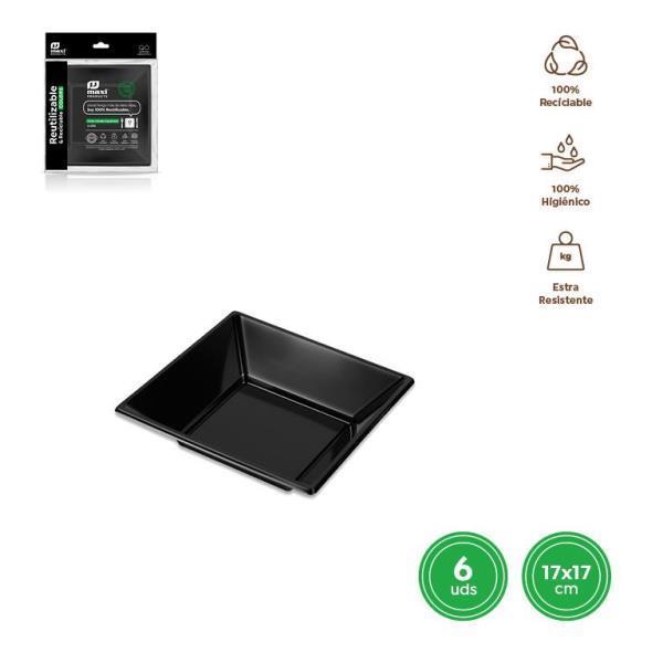 Paquete de 6 unidades de plato hondo cuadrado de color negro fabricado pp 100% reciclable. Medidas 17x17cm.