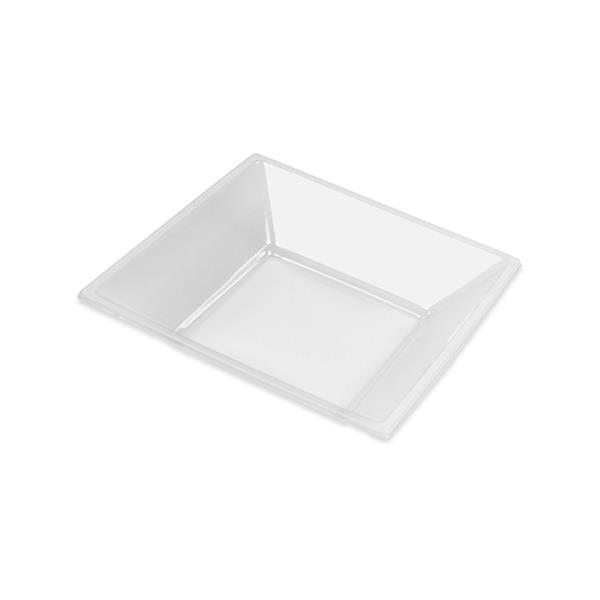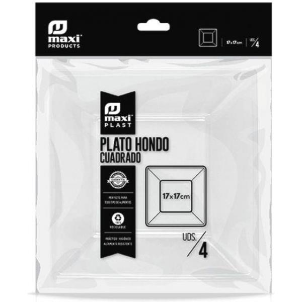 Plato de plástico hondo de formas rectilíneas apto para servir todo tipo de alimentos. Fabricado en poliestireno alimentario transparente, no apto para calentar en microondas. Medidas: 18x18 cm. El paquete incluye 4 unidades.