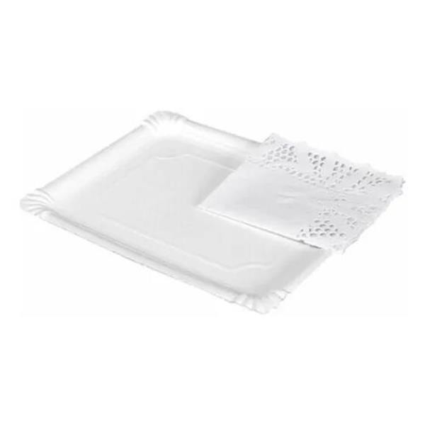 Presenta tus dulces, aperitivos o postres con un toque elegante gracias a esta bandeja rectangular de cartón con blonda. Medidas: 34 x 42 cm.