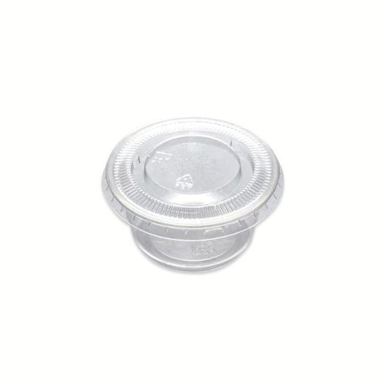 Salsera de plástico desechable transparente con tapa, ideal para el depósito de salsas y líquidos. Fabricadas en poliestireno con una capacidad de 60 cc. El paquete incluye 50 unidades.