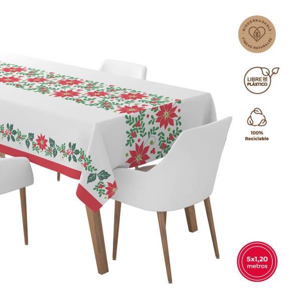 Rollo mantel decorado con motivos navideños y fabricado con materiales reciclables. Medidas: 1,2x5 metros.