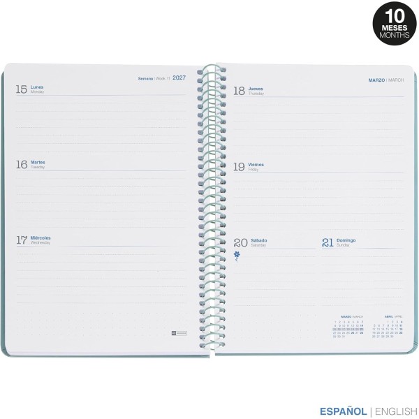 Agenda escolar de 10 meses, ideal para organizar el curso académico de septiembre 2026 a junio 2027. Su diseño en semana vista (S/V) permite visualizar de un solo vistazo toda la semana, facilitando la planificación y el seguimiento de tareas. Cuenta con tapa resistente y espiral metálica en color verde, además de cantos redondeados para mayor durabilidad y comodidad de uso. Incluye secciones prácticas como planning mensual, calendario escolar, seguimiento de exámenes y trabajos, y control de ausencias, ofreciendo una organización completa del curso. Formato A5 (aprox. 15 x 21 cm), cómodo para escribir y fácil de transportar en mochila o bolso, perfecto para el día a día escolar.