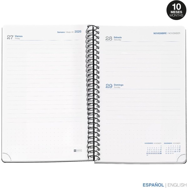 Agenda escolar de 10 meses, perfecta para el curso académico de septiembre 2026 a junio 2027. Su formato de día por página, con sábado y domingo en la misma hoja, permite una organización clara y detallada del día a día. Incluye prácticos apartados como calendario escolar, horario trimestral, planificación mensual, seguimiento de exámenes y trabajos, así como control de ausencias, facilitando una gestión completa del curso. Su tamaño compacto de 11,7 x 17,4 cm la hace ligera y fácil de transportar en mochila o bolso.