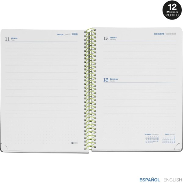 Agenda escolar de 12 meses, ideal para organizar el curso académico de septiembre 2026 a agosto 2027. Dispone de un formato práctico de una página por día, con sábado y domingo compartiendo hoja. En su interior encontrarás secciones útiles como datos personales, calendario escolar, horario trimestral, planificación mensual, seguimiento de exámenes y trabajos, planificador de gastos, mapamundi y páginas adicionales para anotaciones. Su formato A5 (150 × 213 mm) ofrece un espacio cómodo para escribir, siendo fácil de transportar en mochila o bolso.