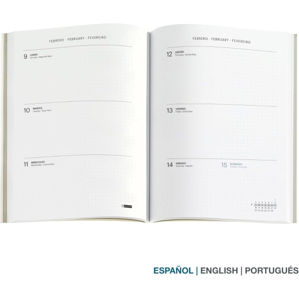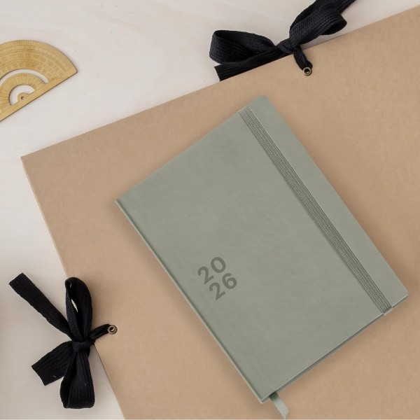 Organiza tu año con comodidad gracias a su vista horizontal semanal de lunes a domingo en doble página, ideal para planificar de enero a diciembre con una visión clara de todas tus actividades. Su tapa de símil piel en gris suave, con acabado gomoso al tacto, aporta un aspecto profesional y moderno. Incorpora cierre elástico, cortes tintados y cinta marcapáginas coordinada para un uso cómodo y elegante en el día a día. Con un tamaño 140 x 190 mm, es ligera, manejable y perfecta para llevar en el bolso, mochila o maletín, ya sea para clase, trabajo o casa.