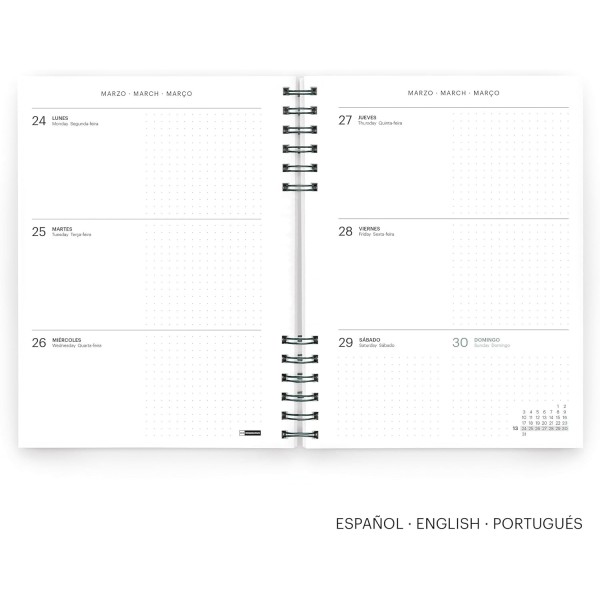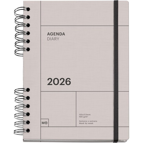 Planifica tu año con una agenda semanal pensada para quienes necesitan visión global, orden y un estilo elegante. Formato semana vista de enero a diciembre 2026, con distribución clara de lunes a domingo. Perfecta para equilibrar trabajo, estudios y vida personal de un solo vistazo. Tapa en tono gris suave con acabado plastificado mate y detalles en negro, aportando un estilo limpio, profesional y adaptable a cualquier entorno. Medidas 160.5 x 218 mm, encuadernación wire-O metálica y cierre elástico que protege tus notas y mantiene la agenda siempre en orden.