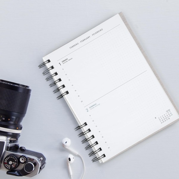 Organiza tu año 2026 con una agenda diaria diseñada para quienes buscan claridad, orden y un toque elegante en su día a día. Cada día de enero a diciembre cuenta con una página completa para anotaciones, exceptuando sábados y domingos, que comparten página. Ideal para agendas apretadas, listas de tareas, ideas, citas y recordatorios. Tapa resistente, acabado mate texturizado y stamping en negro. Medidas 164 x 218 mm, encuadernación metálica wire-O y cierre elástico para mantener tus páginas protegidas.