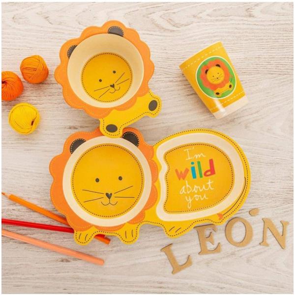 Vajilla infantil fabricado en material de bambú con dibujo de león. Incluye: vaso, plato y cuenco. No apto para microondas ni lavavajillas.