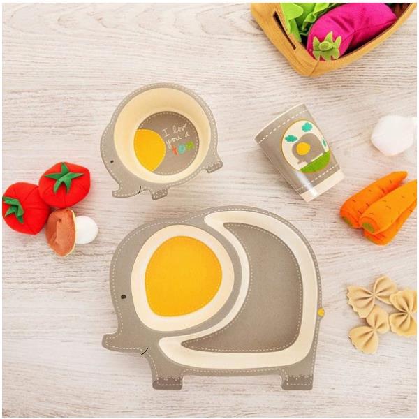 Vajilla infantil fabricado en material de bambú con dibujo de elefante. Incluye: vaso, plato y cuenco. No apto para microondas ni lavavajillas.