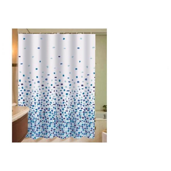 Cortina de baño decorada de 140x180 cm fabricada en poliéster con anillas de plástico.