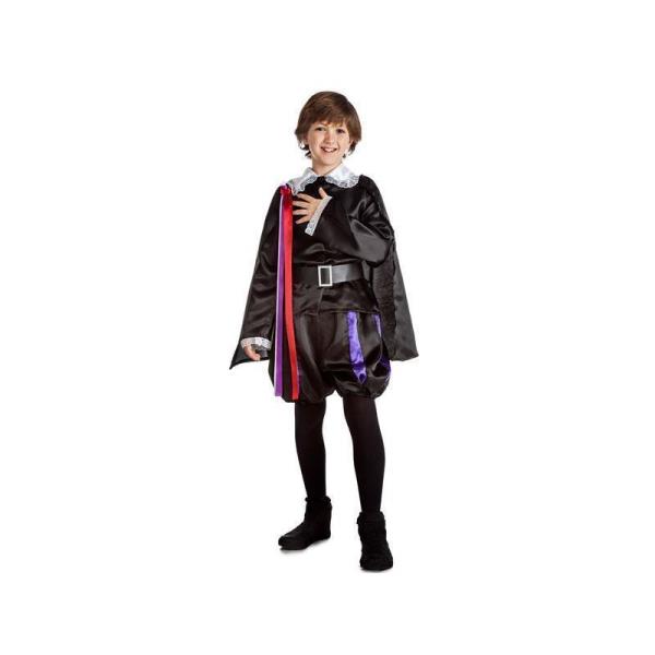 Disfraz infantil de Tuno para niños de 5 a 6 años. Incluye el traje negro con pantalones, cinturón, camisa y capa.