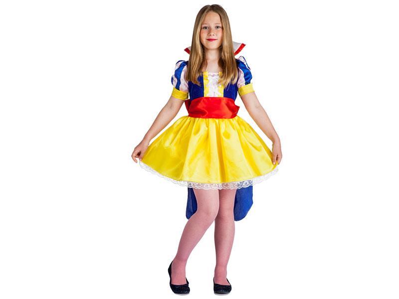 Disfraz de Blancanieves Infantil para niñas de 5 a 6 años. El vestido es amarillo y azul con una cinta roja en la cintura y la capa de color azul. Además incluye un tocado para el pelo.