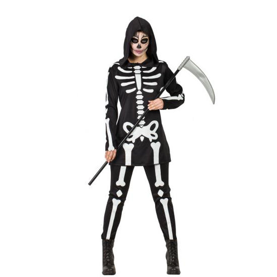 Disfraz de esqueleto para mujer. Talla S. Incluye vestido con capucha y pantalones.