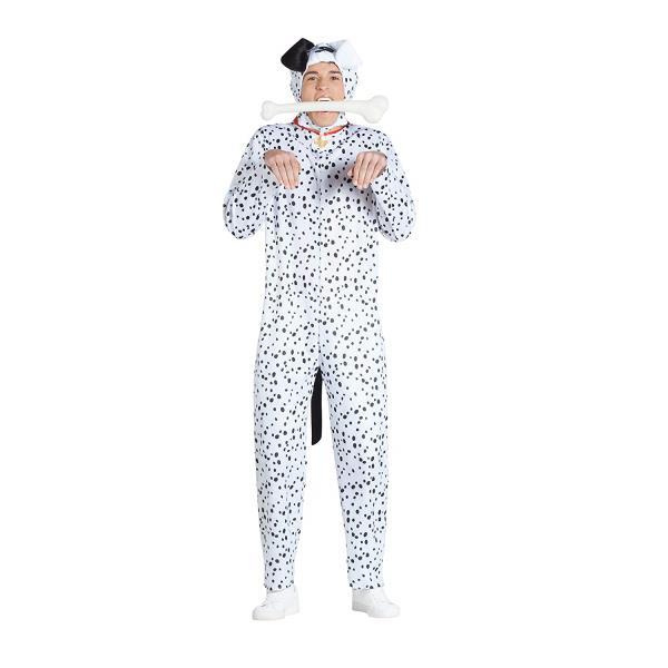Disfraz adulto de dálmata de la talla M-L. Se compone de mono con cola y capucha.