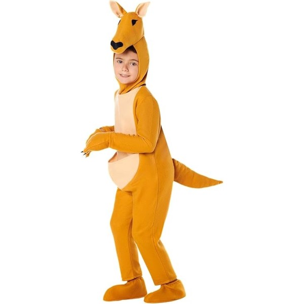 Disfraz infantil de canguro talla 3-4 que incluye capucha, mono con cola, guantes y cubrebotas.