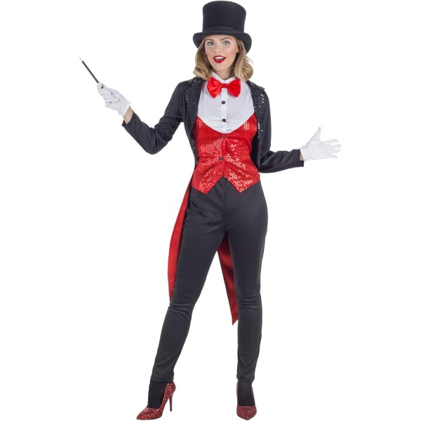 Deslumbra en carnaval o fiestas temáticas con este elegante disfraz de maga de la talla M-L. El conjunto incluye chaqué negro, chaleco rojo con camisa integrada, pajarita y pantalones.