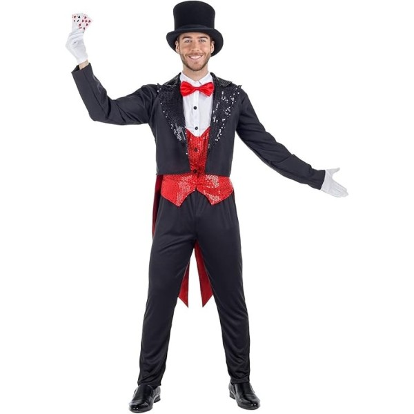 Convierte cualquier evento en un espectáculo con este elegante disfraz de mago, ideal para Carnaval, fiestas temáticas, animación o eventos infantiles. El conjunto incluye chaqué negro, chaleco rojo con camisa integrada, pajarita y pantalones. Talla M-L.