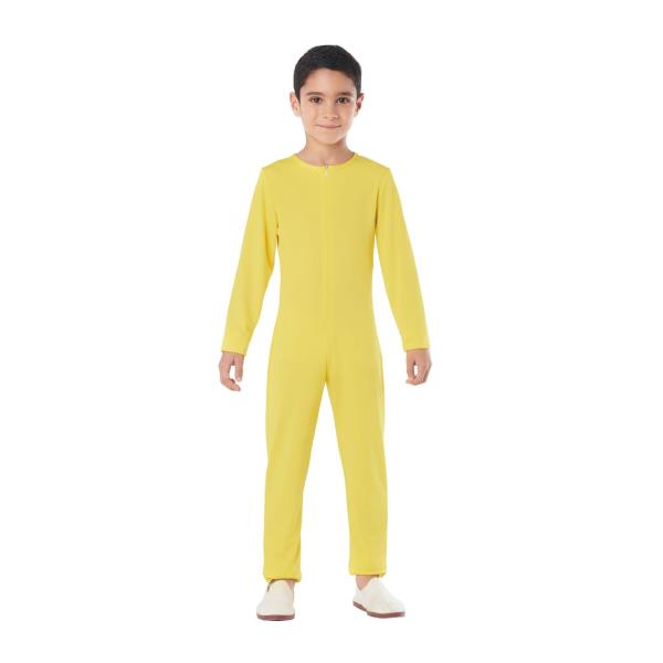 Mono spandex unisex color amarillo talla 7-9 años con cremallera delantera.