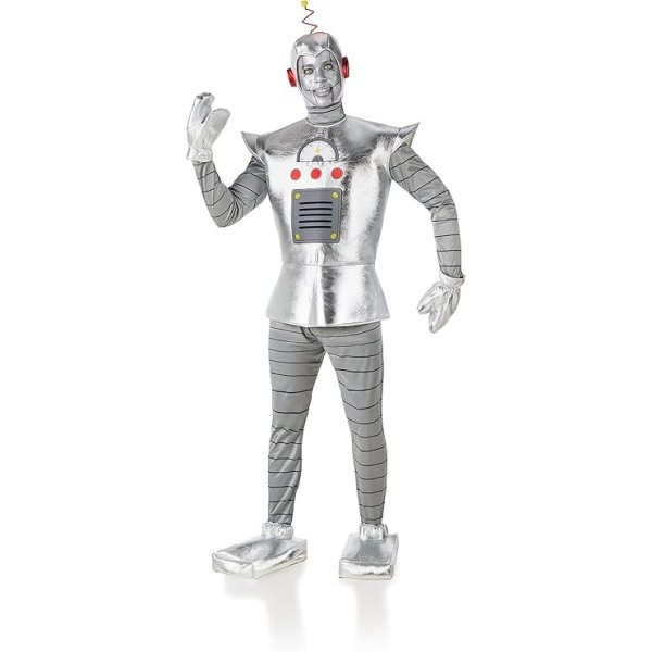 ¡Transforma cualquier fiesta en una aventura futurista con este increíble disfraz de robot para adulto! El set incluye camisa, pantalones a juego, capucha, pieza de cuerpo con acabado metálico y guantes. Talla M-L.