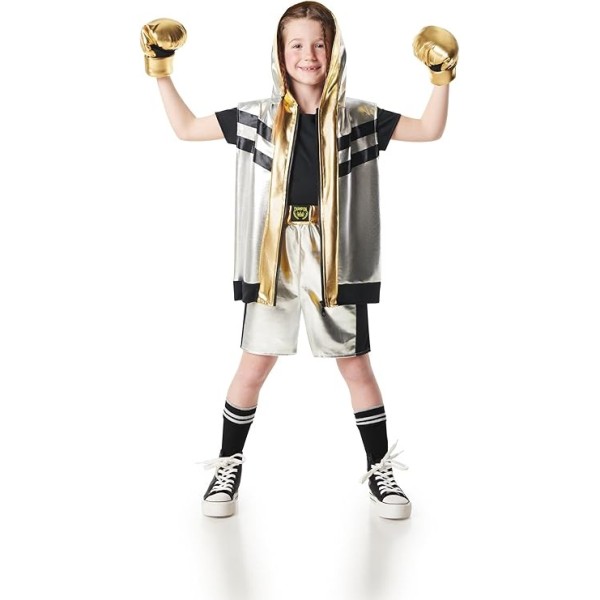¡Tu campeón está listo para subir al ring! Este disfraz de boxeador para niños de 7 a 9 años incluye todo lo necesario para que se convierta en una auténtica estrella del combate. El conjunto está formado por una chaqueta sin mangas con capucha en acabado metalizado, pantalón corto a juego y guantes acolchados.