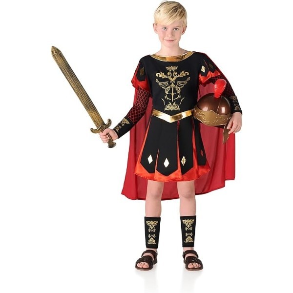 Disfraz de centurión romano infantil talla 7-9 años. El conjunto incluye bata, capa, brazaletes y perneras creando un look completo.