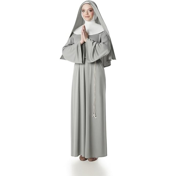 Disfraz de monja para mujer de la talla M-L perfecto para carnaval, fiestas temáticas. Incluye una túnica larga de estilo tradicional, acompañada de un cinturón de cordón para ajustarla cómodamente a la cintura. El conjunto se completa con capucha, cuello blanco y un velo amplio, que aportan el toque auténtico propio de un hábito religioso.
