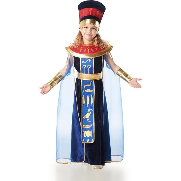 Este disfraz es perfecto para que las más pequeñas se conviertán en la auténtica reina del Antiguo Egipto. La túnica en tonos azules con detalles dorados la hará sentir como una faraona real, mientras que la capa transparente aporta un toque mágico en cada movimiento. El sombrero y los brazaletes completan un conjunto cómodo, llamativo y ideal para carnavales, fiestas temáticas o funciones del cole. Talla 5-6 años.
