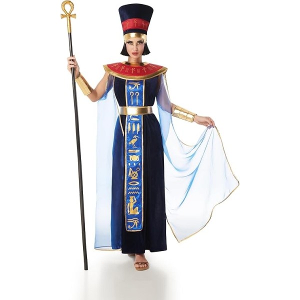 Conviértete en una auténtica reina del antiguo Egipto con este elegante disfraz de faraona de la talla XL. Su túnica azul con jeroglíficos dorados, la capa vaporosa y el tocado real crean un look majestuoso y lleno de detalle. Perfecto para carnaval, fiestas temáticas o espectáculos históricos.