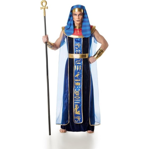 Conviértete en un auténtico faraón del antiguo Egipto con este disfraz en talla XXL. La túnica azul con detalles dorados y la capa ligera crean un look imponente, mientras que el tocado y los brazaletes completan el estilo real. Perfecto para carnaval, fiestas temáticas o espectáculos.