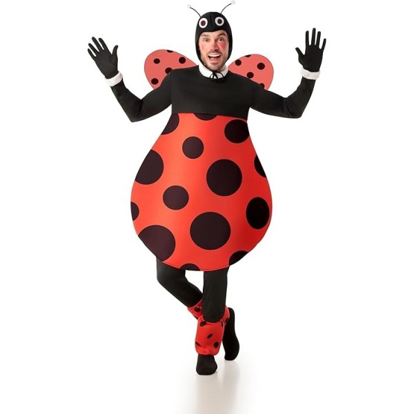¡Dale un toque divertido y encantador a cualquier fiesta con este disfraz de mariquita de la talla XL! El traje incluye un cuerpo acolchado rojo con lunares negros, súper cómodo y ligero, que aporta la forma redondeada típica de una mariquita. La capucha con antenas, las alas a juego y los calentadores estampados completan un look adorable y muy vistoso.