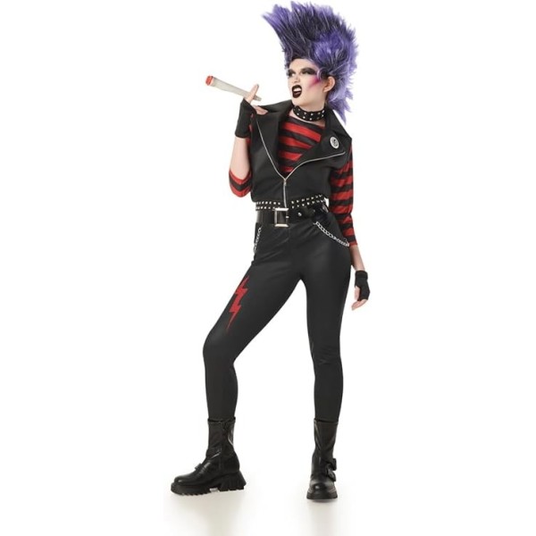 Disfraz de punki talla XXL para llevar un look atrevido y lleno de actitud en carnaval. El conjunto incluye una camisa a rayas rojas y negras, una chaqueta sin mangas estilo biker, un pantalón ajustado con detalles estampados, además de accesorios clave para completar el look punk: gargantilla con tachuelas, cinturón con cadena y mitones negros.