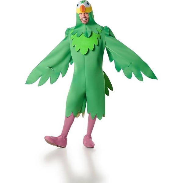 Con este divertido disfraz de papagayo M-L podrás convertirte en el ave más alegre y colorida de la fiesta. El disfraz incluye una cabeza con pico y ojos, un cuerpo acolchado con grandes alas, perneras y cubrezapatos que imitan las patas del ave.