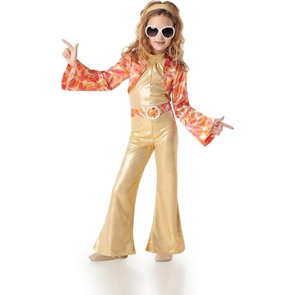 ¡Los años 70 vuelven a brillar! Este fantástico disfraz disco para niñas talla 10-12 años es perfecto para carnaval o fiestas temáticas. El conjunto incluye diadema, chaqueta estapada estilo retro, mono dorado con acabado brillante y cinturón.