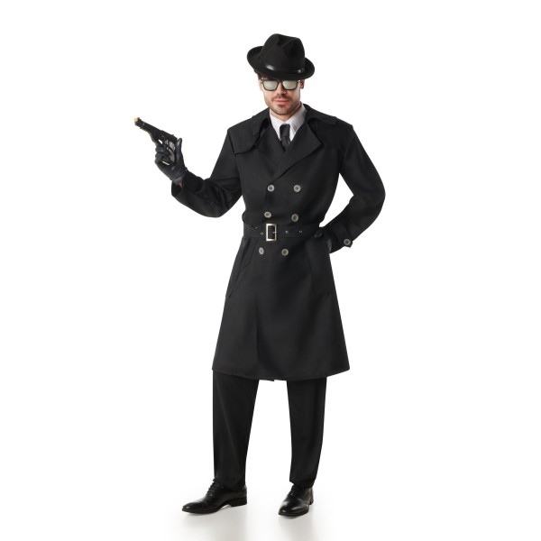 Adéntrate en una misión secreta con este elgante disfraz de espía para adulto de la talla M-L ideal para carnaval o fiestas temáticas. El conjunto incluye una chaqueta larga tipo gabardina, con doble botonadura y cinturón para ajustar la silueta, además de un cuello falso, camisa y corbata.