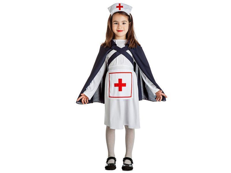 Disfraz infantil de enfermera talla 7-9 años. Se compone de vestido con delantal, capa y tocado.