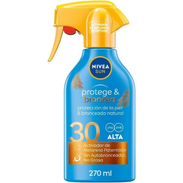 Protector solar Nivea en spray con factor de protección 30+ y con filtros de protección UVA/UVB. Este protector solar aporta una hidratación intensiva a la piel y proporciona un bronceado bonito y saludable sin necesidad de autobronceadores.