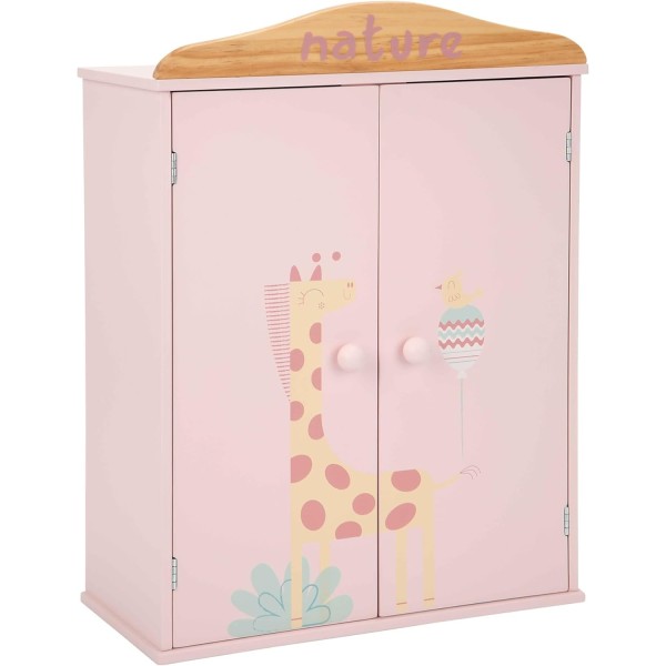 Este precioso armario de madera es el complemento ideal para guardar todos los conjuntos y accesorios de las muñecas. Su diseño en tono rosa suave aporta un toque elegante y dulce, perfecto para decorar el dormitorio infantil con estilo. Incluye un juego de cinco perchas para colgar la ropita. Medidas: 40 x 20,5 x 54,5 cm.