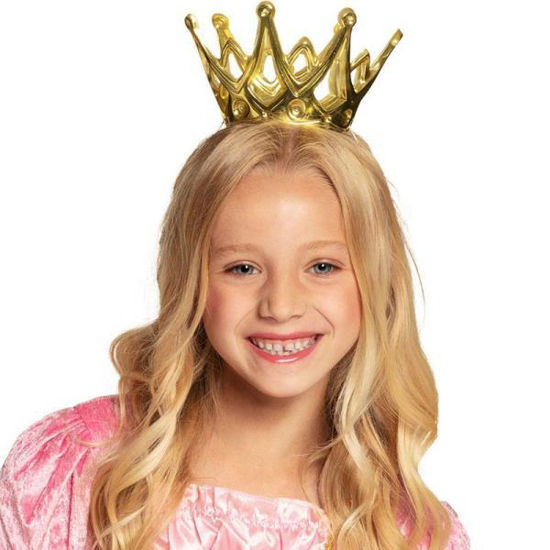 Corona de princesa dorada pequeña. Se sujeta con goma elástica y tiene un diámetro de 8 centímetros.