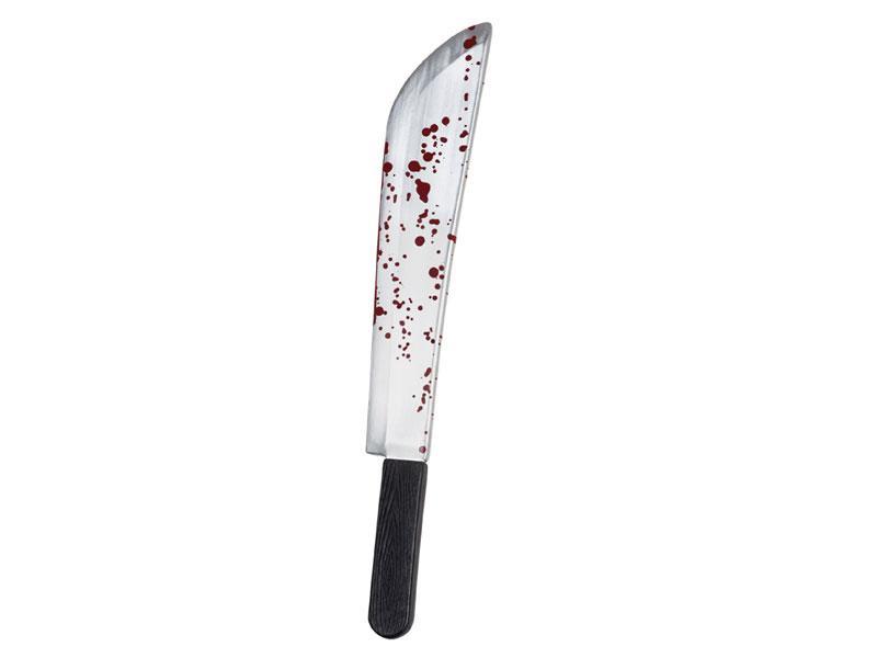 Cuchillo grande del horror con marcas de sangre. Su medida es de 53 centímetros.