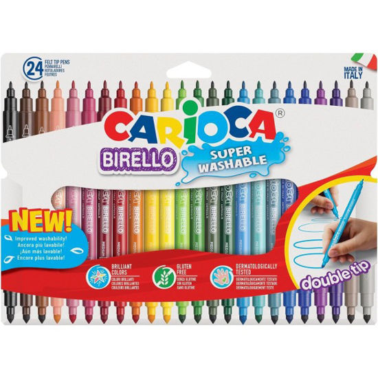 Pack de 24 rotuladores Carioca Birello Super Washable, doble punta (fina y pincel), tinta lavable y no tóxica.