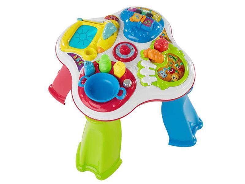 Mesa hobbies primeras actividades. Presenta 4 áreas de juego: arte, música, cocina y jardinería. Los más pequeños podrán aprender canciones en dos idiomas (español e inglés), números, el alfabeto, notas musicales e instrumentos. Las patas se desmontan para poder jugar en el suelo. Dimensiones 52x52x37,5 cm. Funciona con 3 pilas AA de 1.5V (pilas incluidas). Edad 1-4 años.